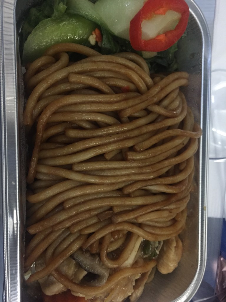 Soon after take off we are offered a choice of ‘beef rice’ or ‘chicken noodle’ and I choose the latter. Good choice that I did as the guy sitting next to me choses the Beef and it looks more like a gravy on rice. Mine is OK but I am way too full to really enjoy it.