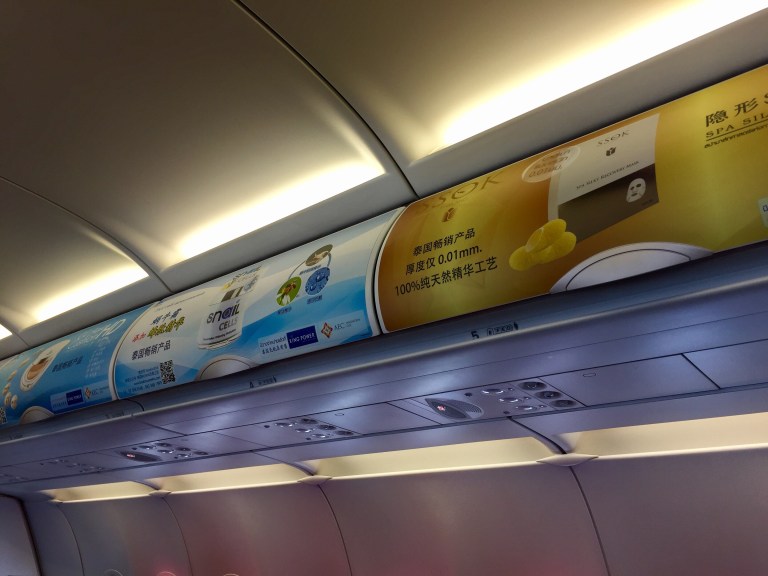 Looking above at the overhead storage bins I see a wall of advertising. Actually very clever: