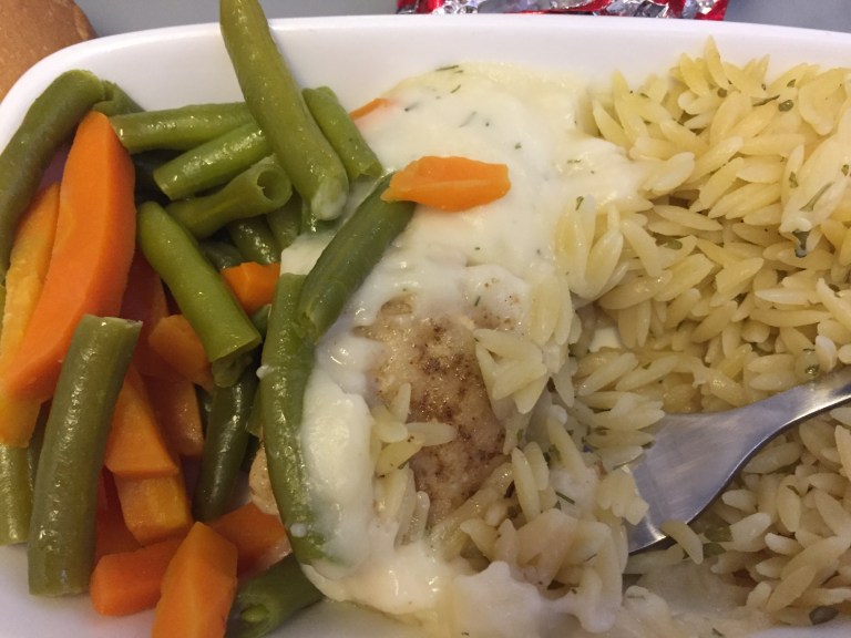 Shortly after take-off my pre-ordered seafood meal arrives. To be honest I am surprised as my original flight is hours later yet they still managed to organize one in such a short amount of time. Impressive, although the meal itself isn’t quite what I feel like. The main consists of mini seafood burgers with pasta ‘rice’ (rigeletto or something sounding-similar) in a creamy mornay sauce and verges. Pretty good. But the entree and dessert is boring – tomato and cucumber slices and fruit! So I ask for the same from the main meal trolley and receive an entree seafood pasta salad and creme caramel dessert instead. It’s lunchtime so I compliment my meal with 2 glasses of red followed by a white. Well, they are very small glasses. And then a coffee.