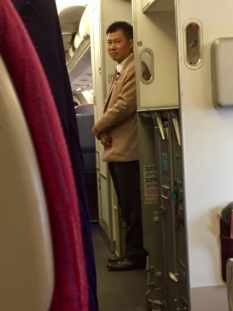 Not a happy camper when I find my seat three rows behind the galley separating Business class from Economy class in seat 33G, an aisle seat in a 2-4-2 configured Airbus A330-300 Thai Airways aircraft. The seat pitch is extremely narrow, and there is an AV box taking up half of my limited leg room under the seat in front, and to top it off, there is a foot stool mechanism that knocks against my shins.