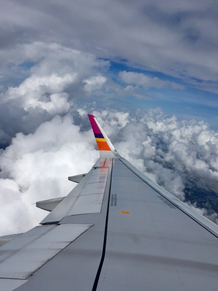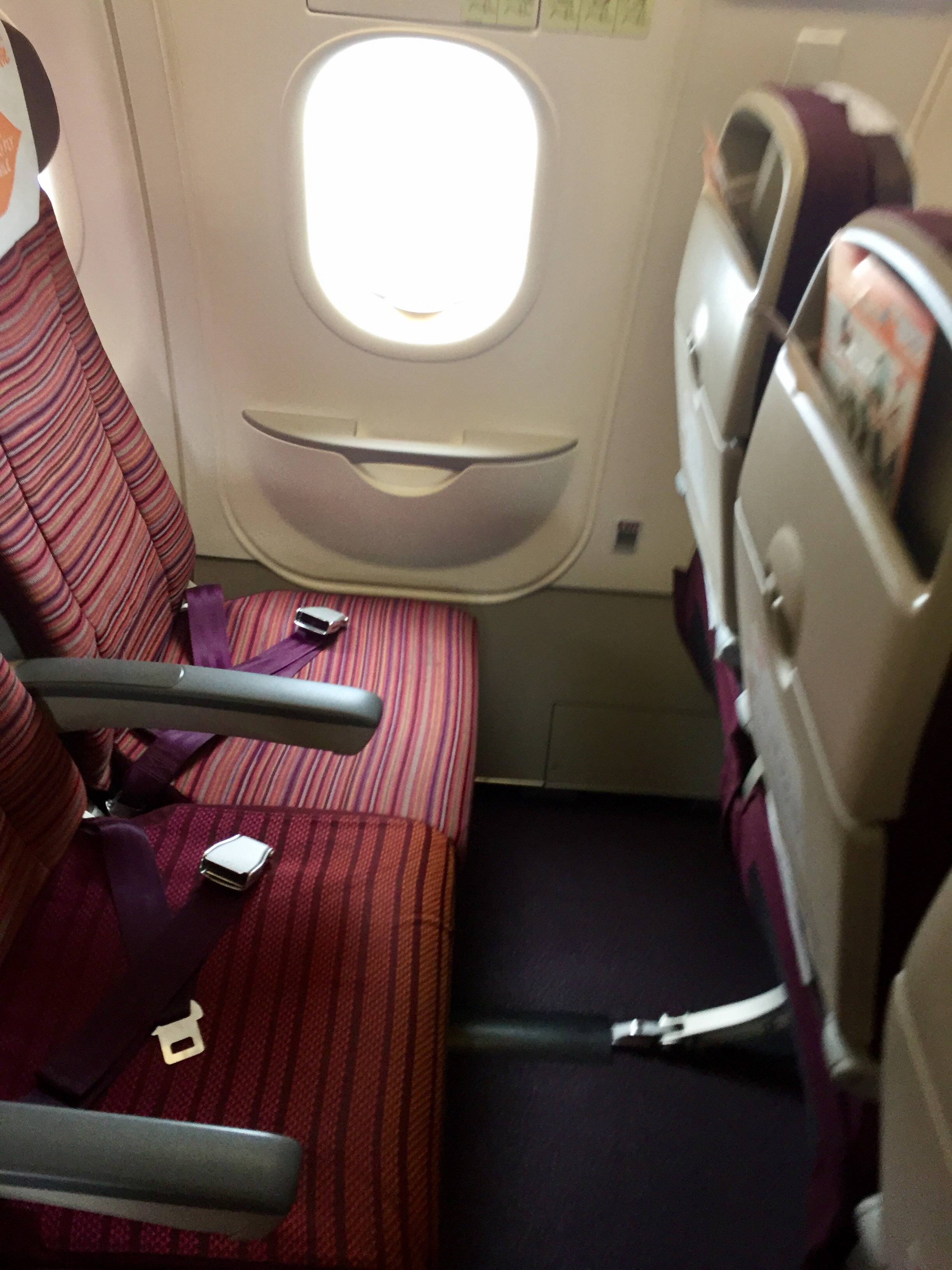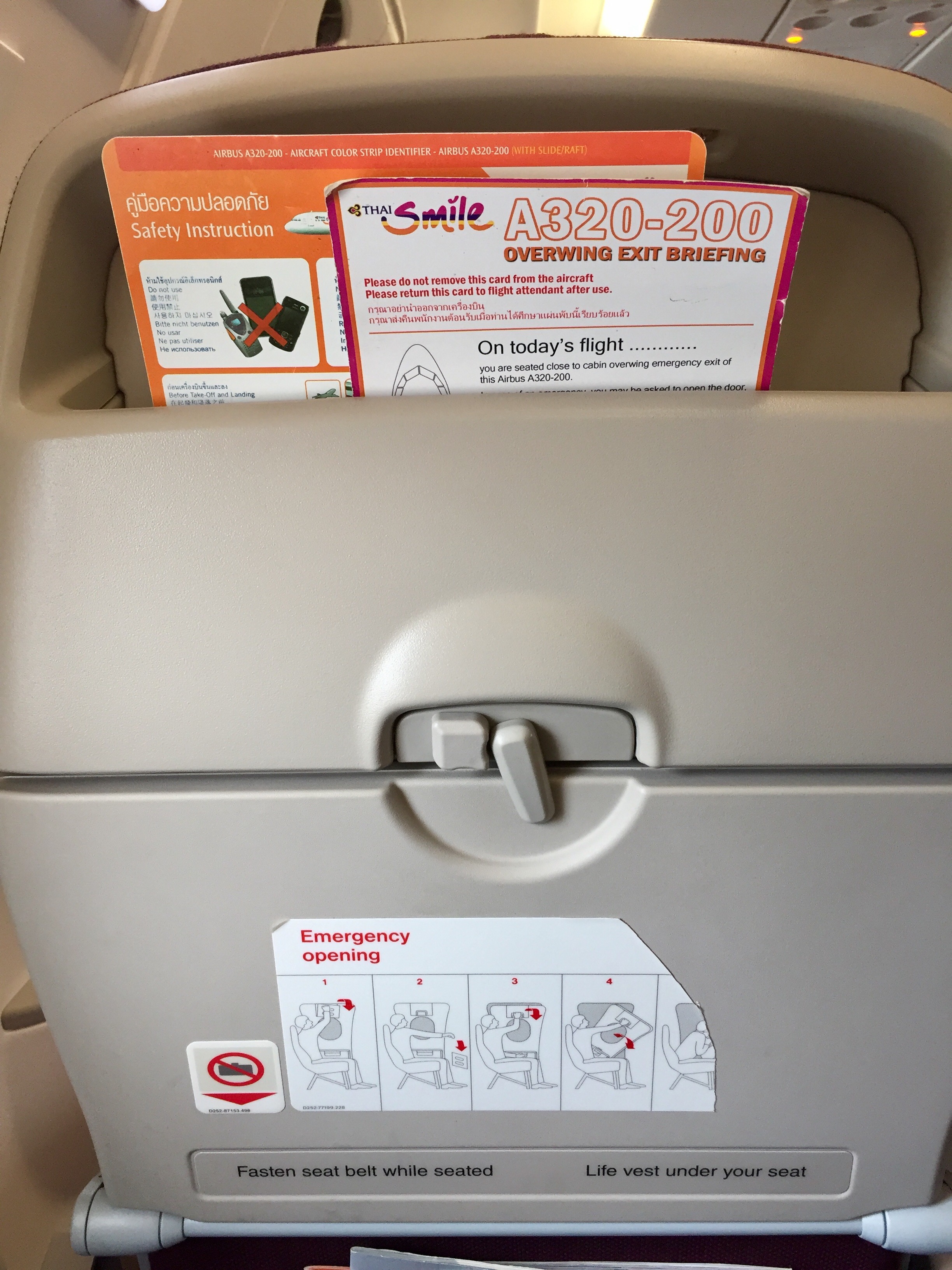 I am sitting in emergency exit seat 42A on this Airbus A320-200 Thai Smile Airways aircraft. It seems to be a slightly older plane compared to the one coming over. There is no one sitting beside me.