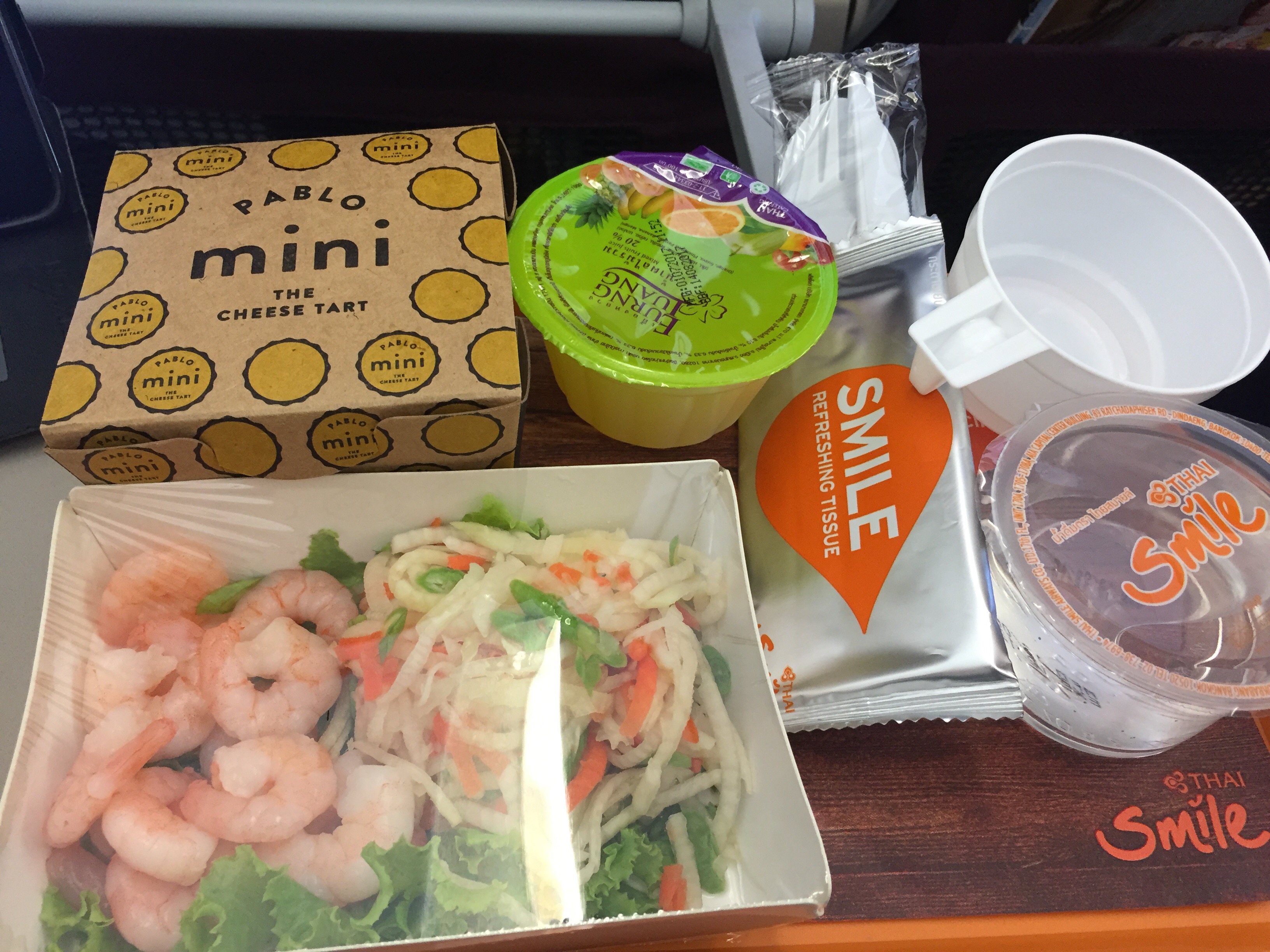 A meal service arrives shortly after take-off comprising of a Thai-style papaya seafood salad, anniversary cheese-cake, fruit drink, and coffee. It is quite good.