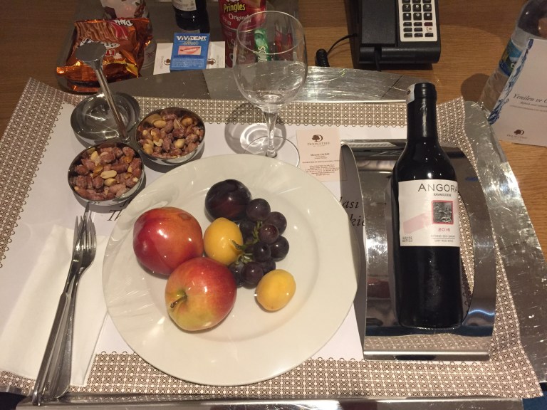 A welcome gift of fruit and a half bottle of red is waiting for me which I enjoy with my room service dinner.