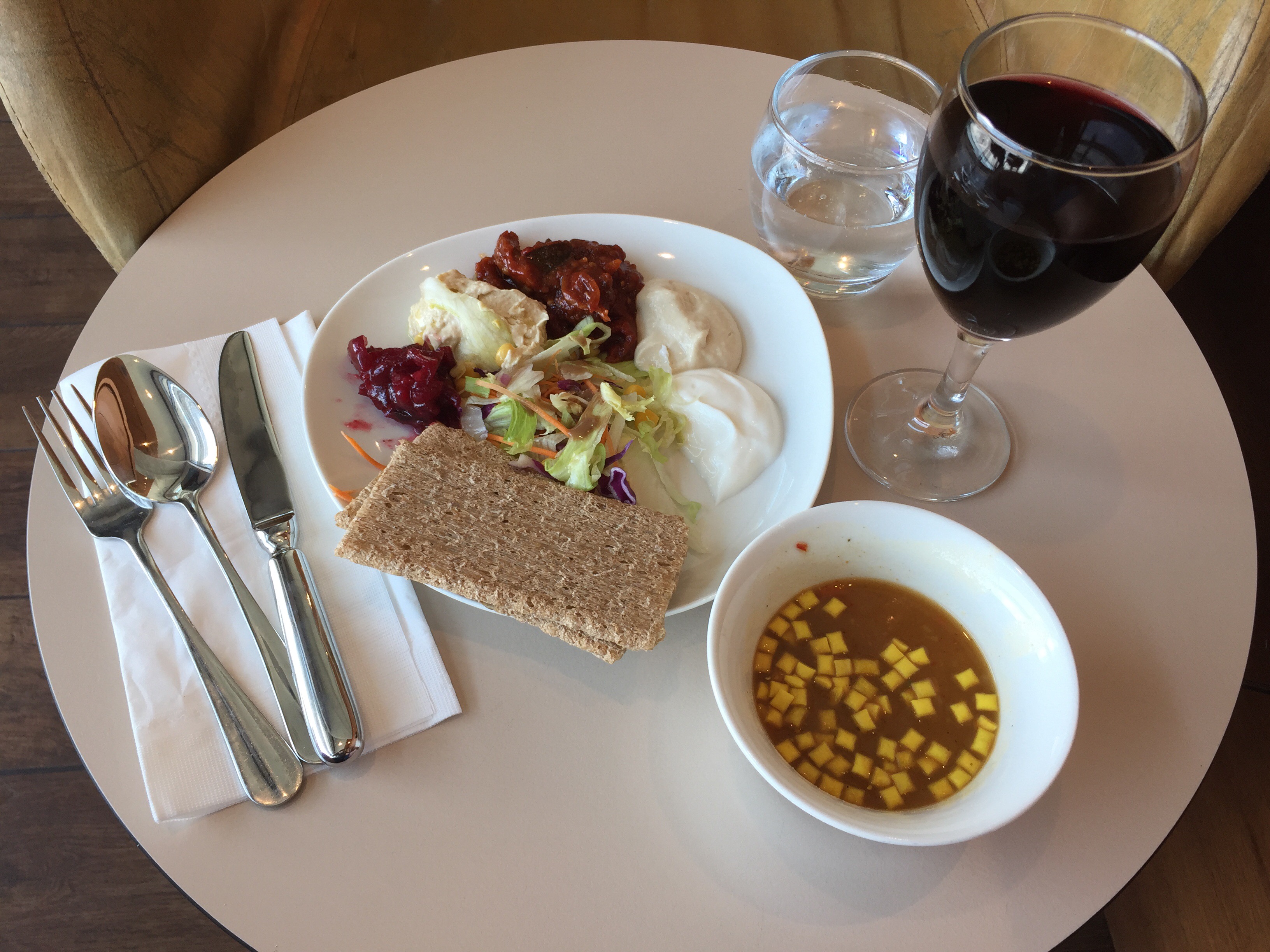 The food selection is poor – no hot food, (except a Yemenite been soup), only a few Israeli salads and stale cake and cookies. I guess I am spoiled living in Asia where the lounges – even the crappy ones, have hot food selections.