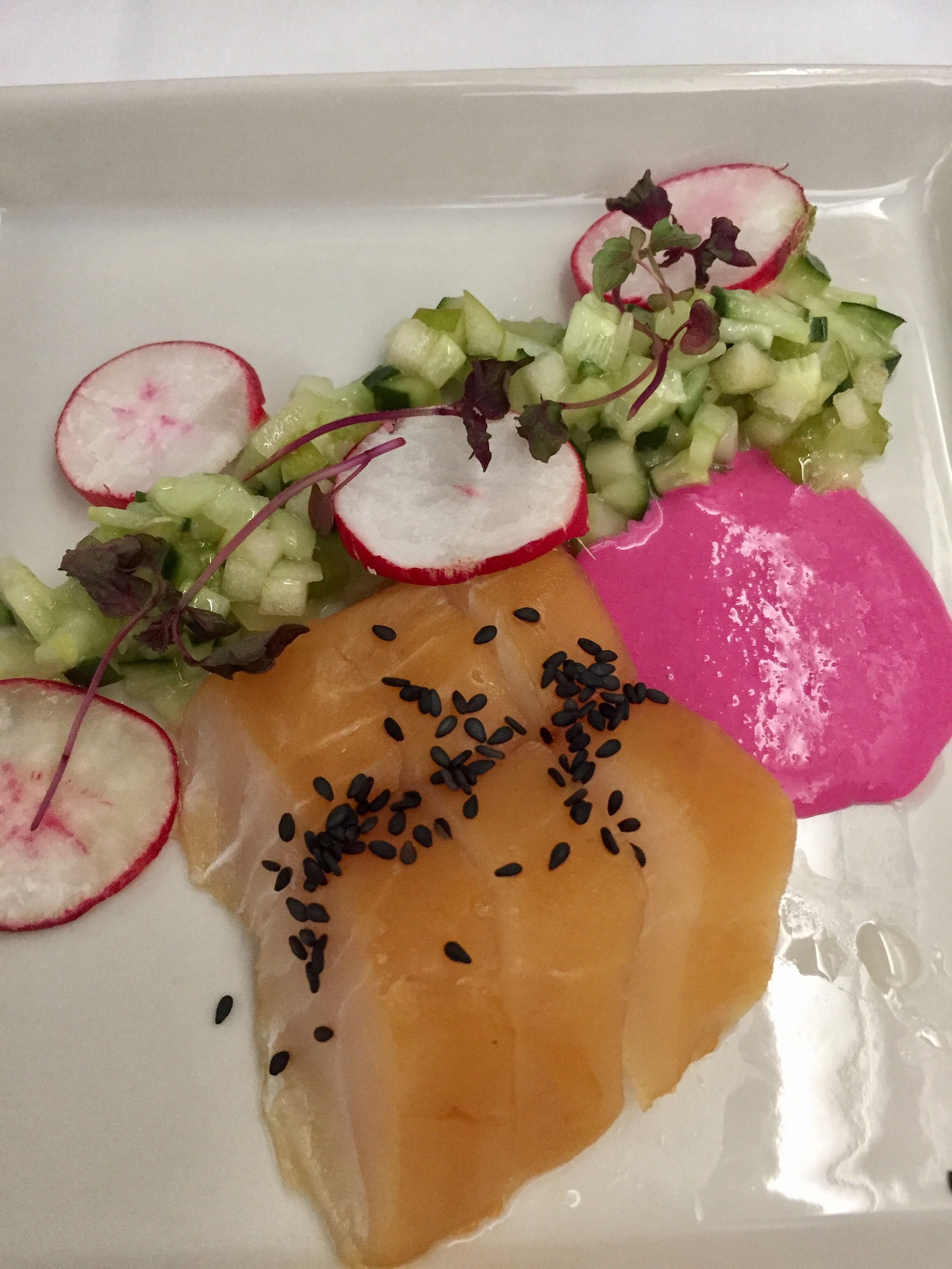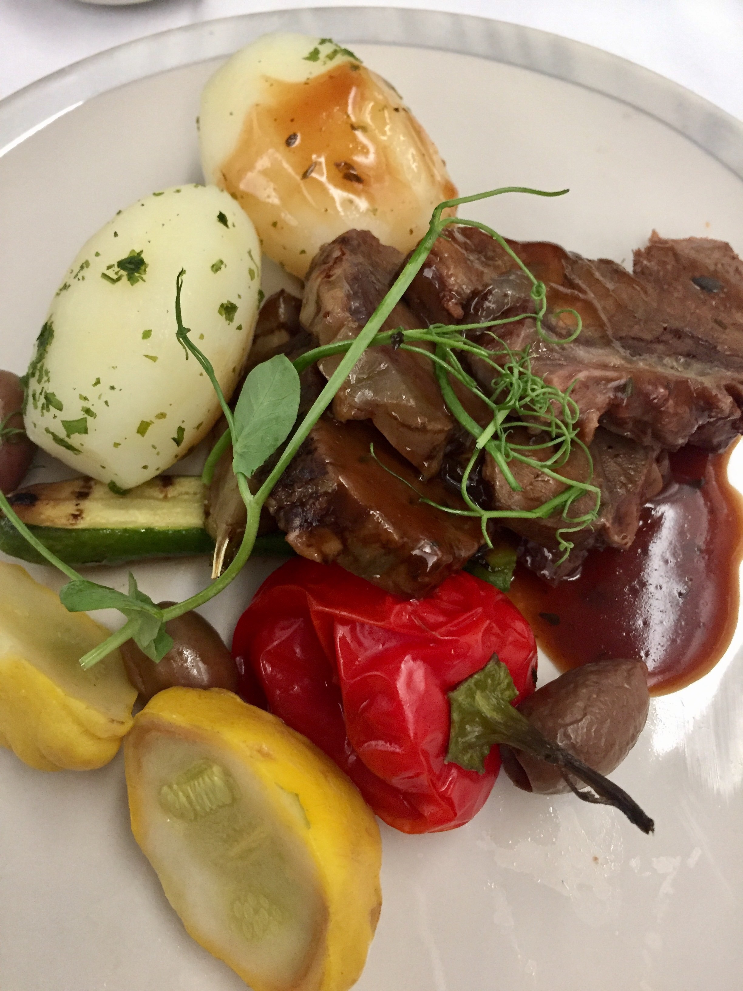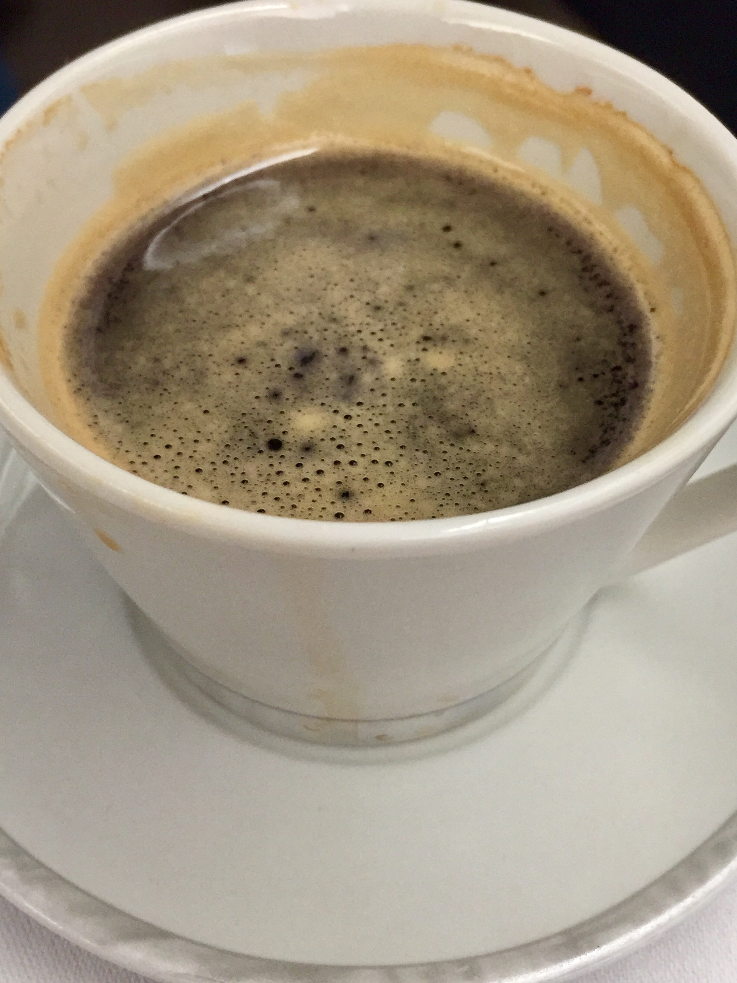 Soon after take-off the a White Russian comes around as well as a chicken and beef satay starter. The appetizer comes next which is a smoked cod dish with beetroot sauce. My partner also hands me some of his pre-ordered duck main. I like the duck, but not the Cod. The wine I choose with my appetizer is an Italian Red – ‘2013 Marchesi de Frescobaldi Castello di Nipozzano ‘Nipozzano’, Chianti Rufina Riserva’, Tuscany – I kid you not – a huge name but a good drop. The beef cheek main is OK with vegetables is OK.