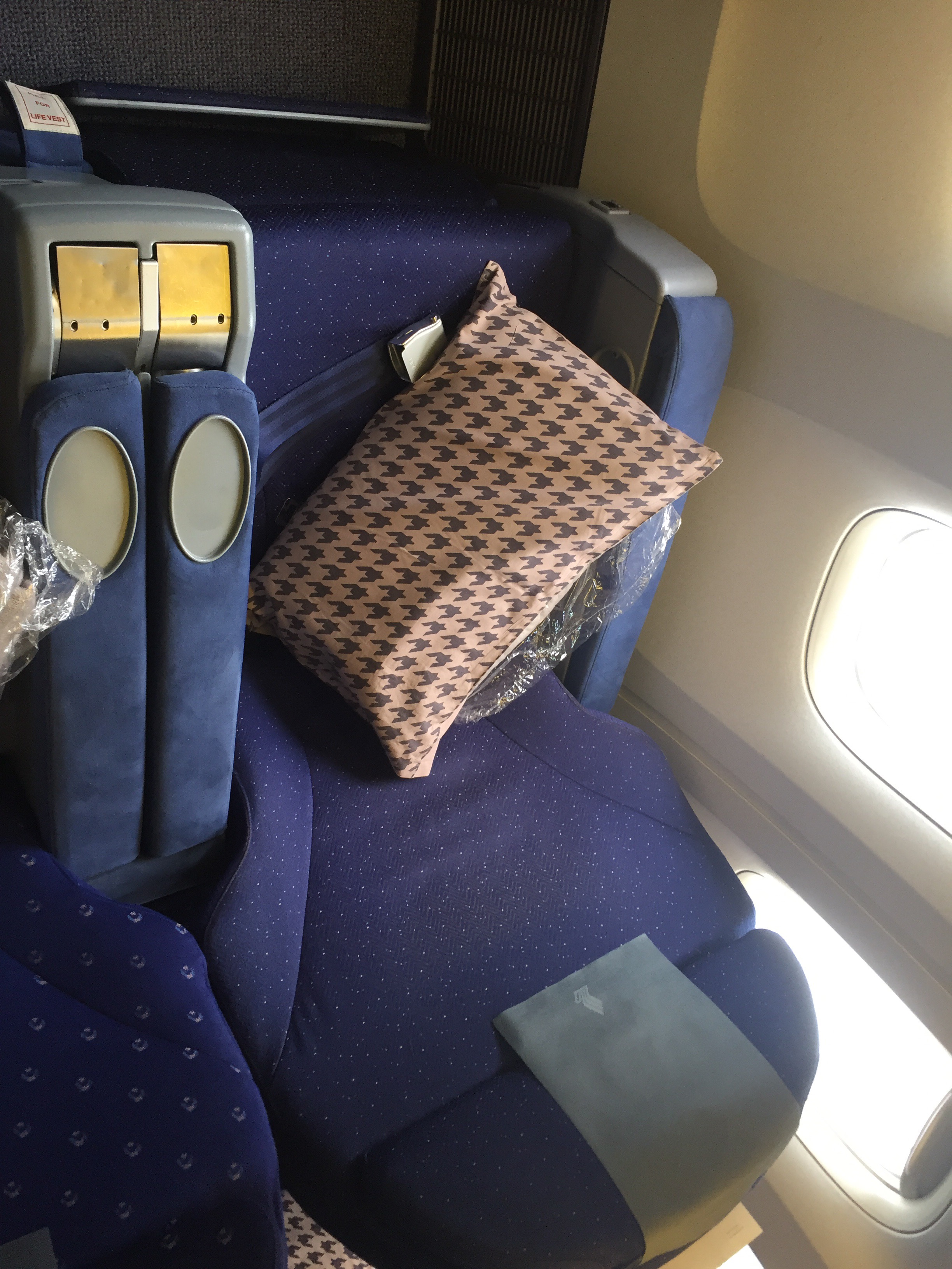 The cabin is dated with older style short-haul seats that do not recline full into a flat-bed position. But they are large, cushiony, and comfy.