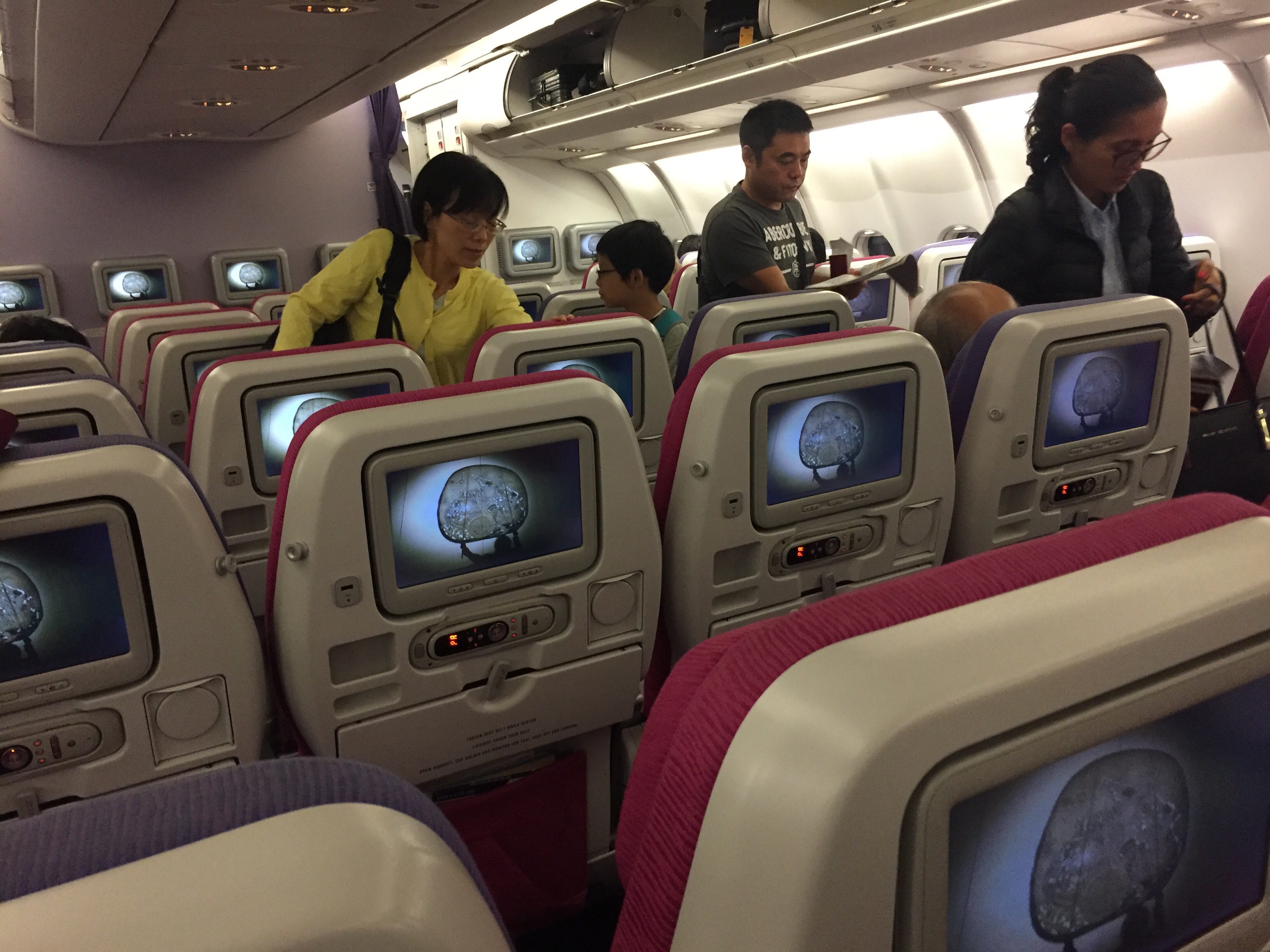 I am sitting in seat 37D, and aisle seat in a 2-4-2 configured Airbus A330-300 Thai Airways aircraft. The theme music and video playing about, “THAILAND – once in a lifetime” is so annoying. They could turn the volume down a bit! Yes, I am tired and it is irritating. Thank god for my iPad with pre-loaded media so I can drift away from it all.