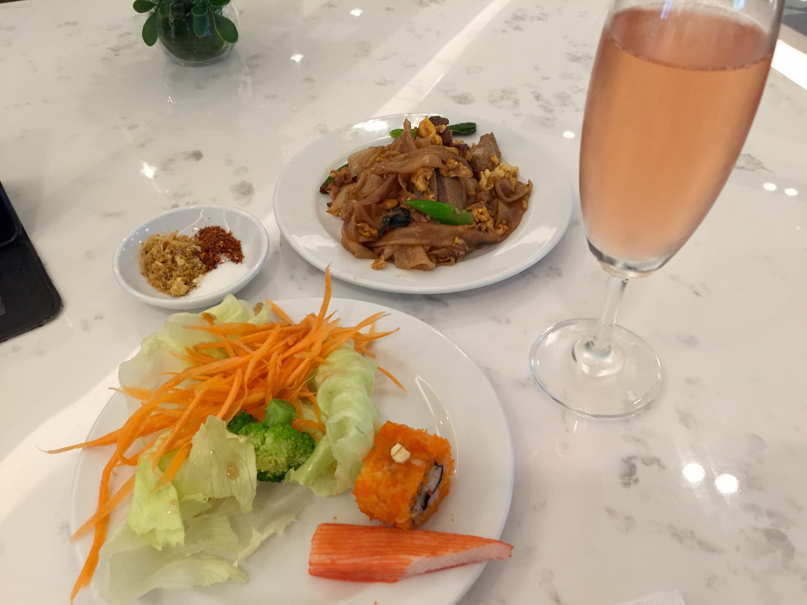 Again I go straight for the dining area and request a BBQ duck on thick noodles. Delicious. A small piece of sushi and salad preempts this, and of course the obligatory glass of sparkling Rose.
