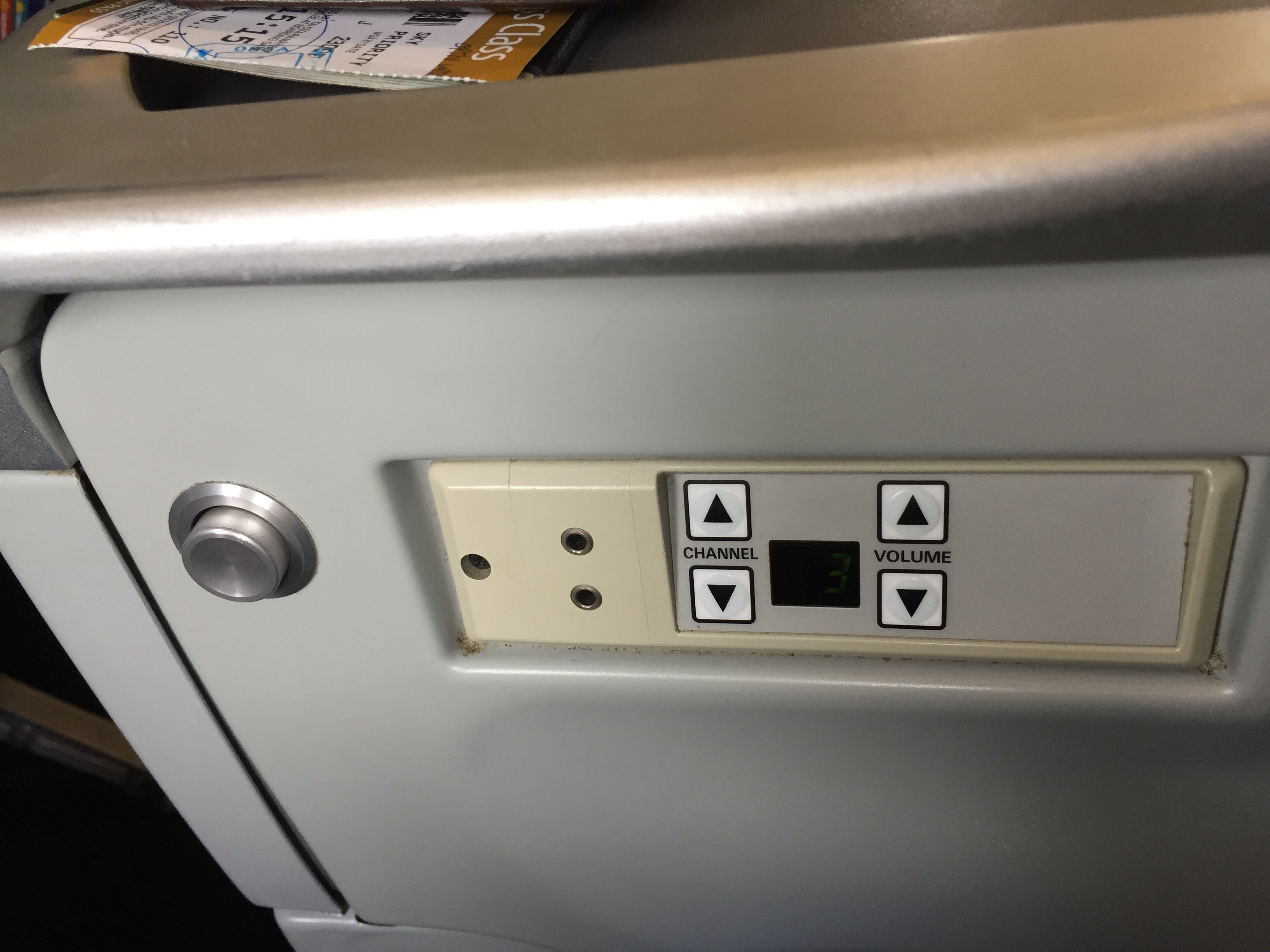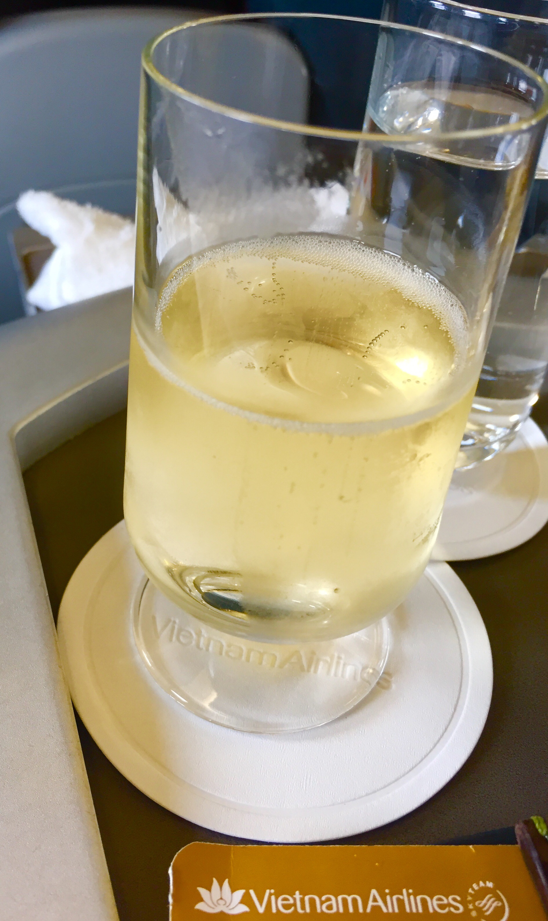 The seat is super basic for Business class – only 1 button to put the seat back a fraction. No AV except for a shared screen that unfolds from the ceiling. It is more domestic then international short haul. The saving grace is as soon as I sit down, I am offered a wet towel and a choice of Champagne, Orange or Apple juice. I choose Champagne.