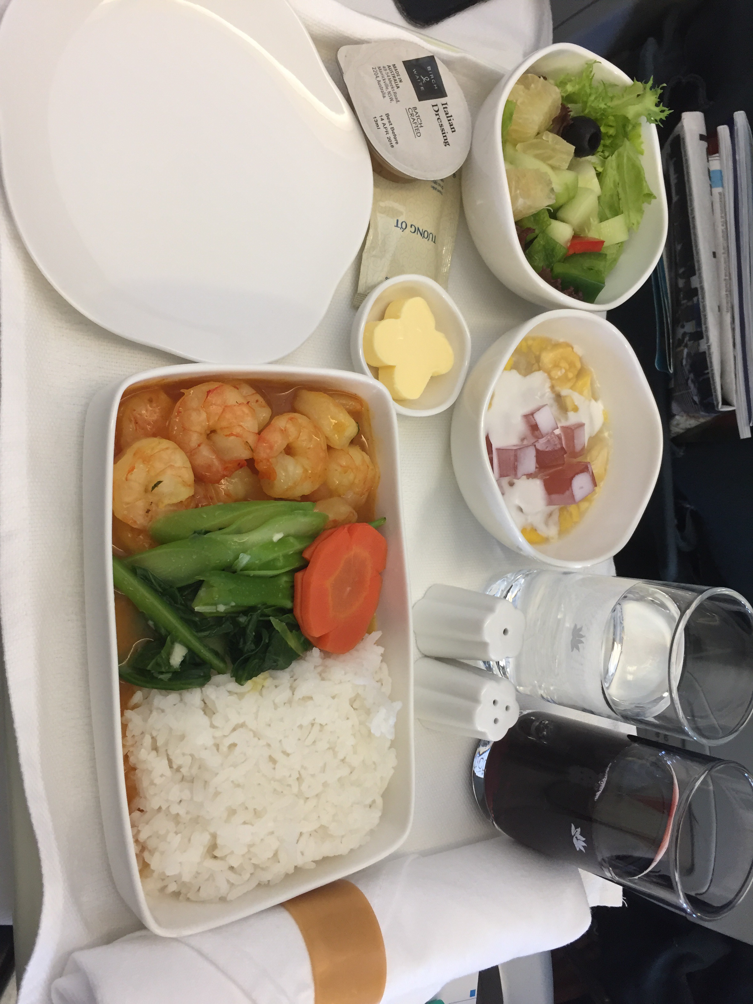 After take-off the refreshment orders are taken with a choice of seafood or pork with rice or beef noodles. I choose the seafood rice with a glass of red wine. I also ask for a blanket and pillow but apparently there are no pillows……but I get 2 blankets instead.