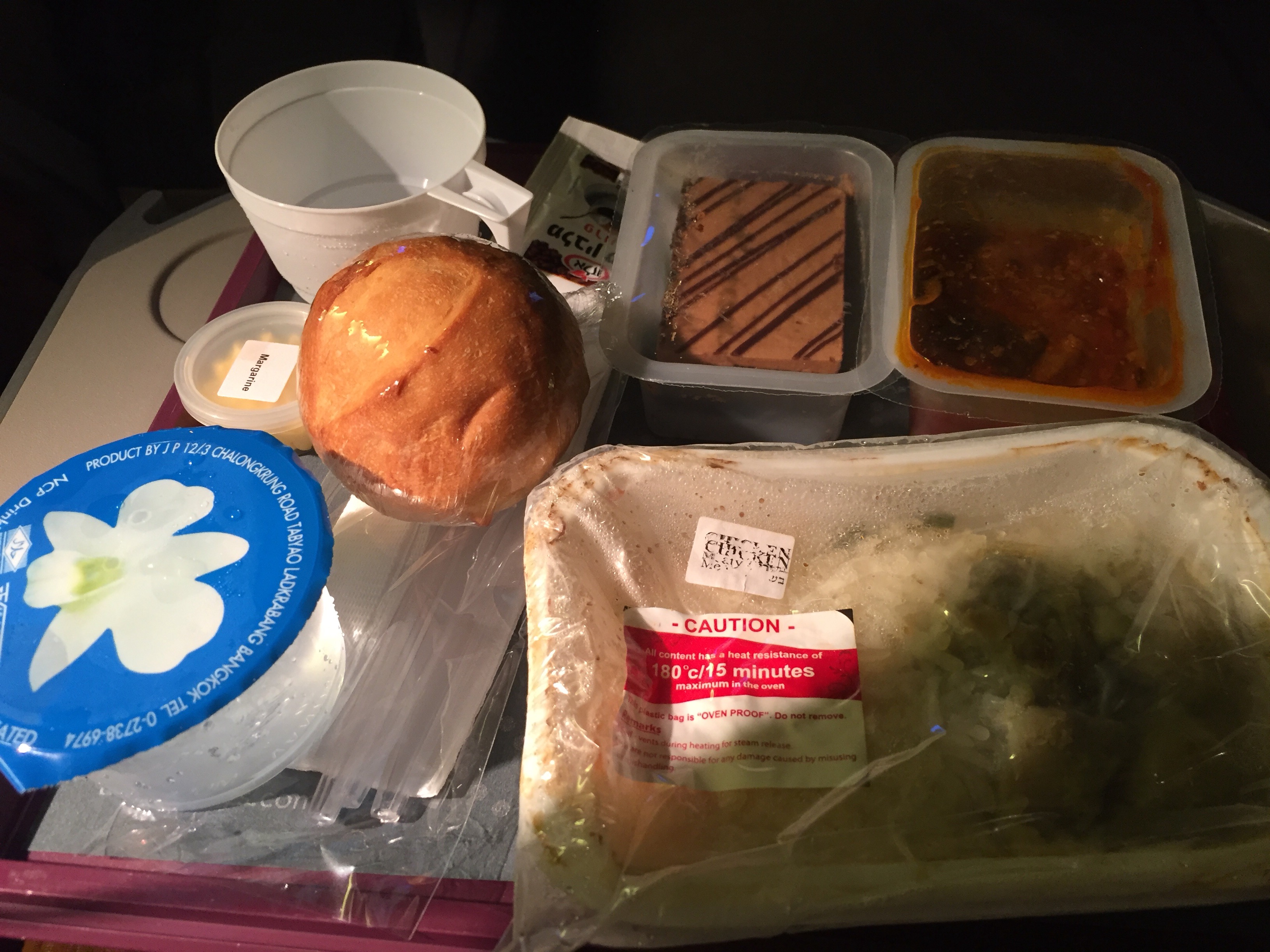 I have ordered a Kosher meal – it’s been a while since last ordering one, and the flight attendant comes around with my box asking if I would like to break the seal. I decline. Actually in hindsight I probably should not have eaten so much in the lounge as Kosher meals are huge compared to standard Economy ones. It turns out to be a dry green chicken curry, dry bread roll, and a stewed tomato and eggplant dish which is actually quite good. A chocolate cream cake serves as dessert. Drink service follows and I order a vodka Diet Coke.
