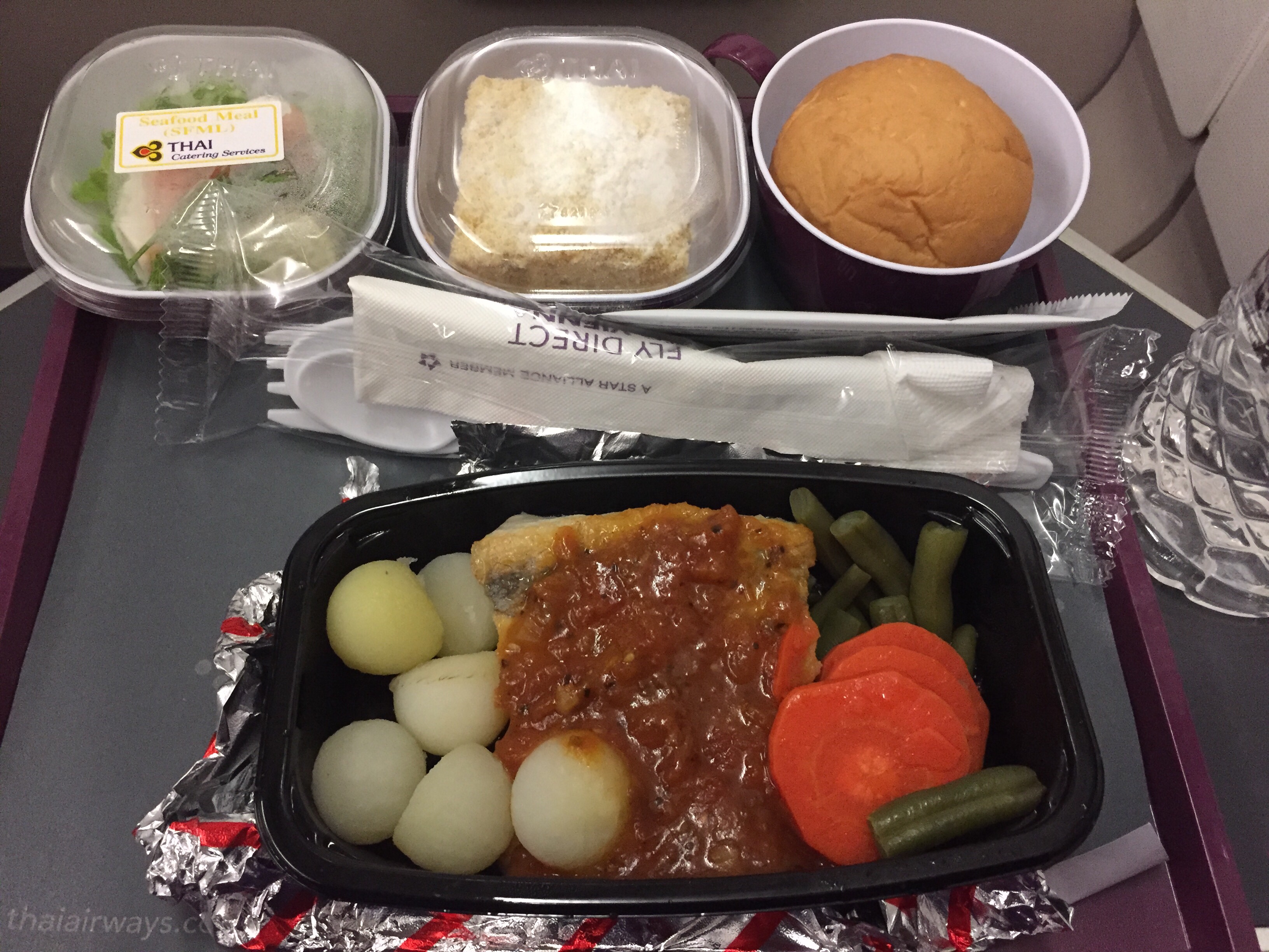 Besides this annoyance the seafood meal I pre-order is very good with a juicy piece of what seems to be Barramundi but is probably a cheaper fish. This is served with a smoked salmon and potato salad, soft bread roll, and a vanilla crumble cake.