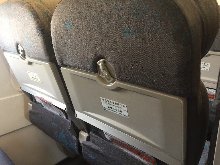 I am sitting in aisle seat 10C, 3rd row of Economy, on this Air Macau Airbus A319 flight to Macau from Bangkok. The seats are old school, larger and ‘spongier’ than the more modern ones, but alas no AV screen to be seen.