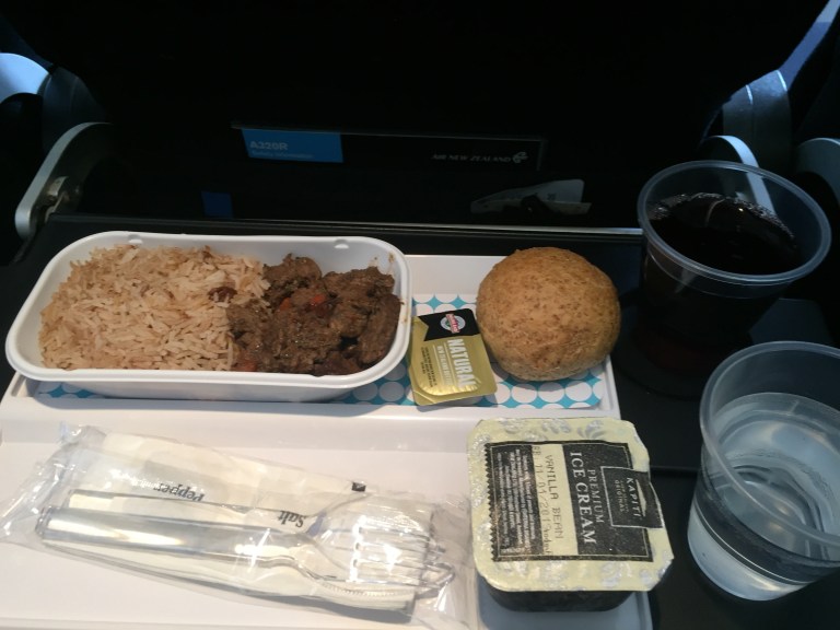I choose the lamb with cumin, warm roll, and vanilla bean ice cream. I also enjoy a glass of NZ Pinot Noir. It’s OK – rice is a bit dry and there is no salad. Luckily I’m not really hungry. The ice cream is good though.