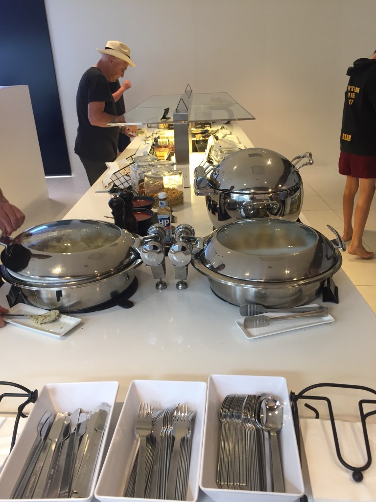 We are warmly greeted and find a spot somewhere child-free and reasonably quiet in order to read a newspaper and relax for a while before boarding.