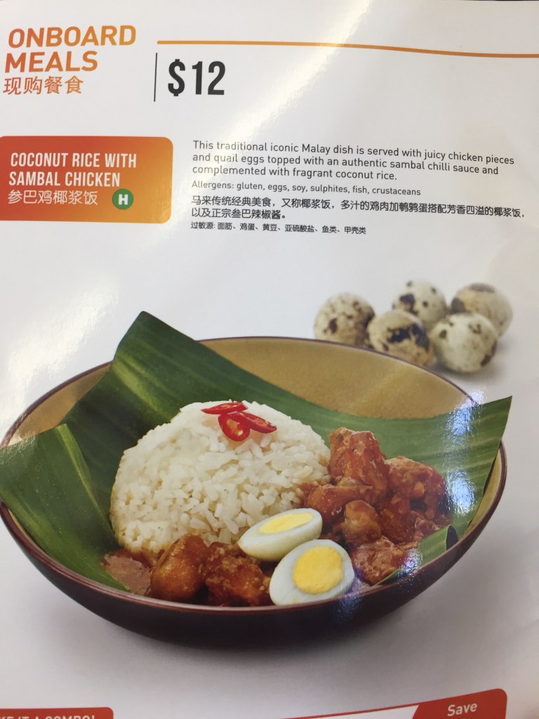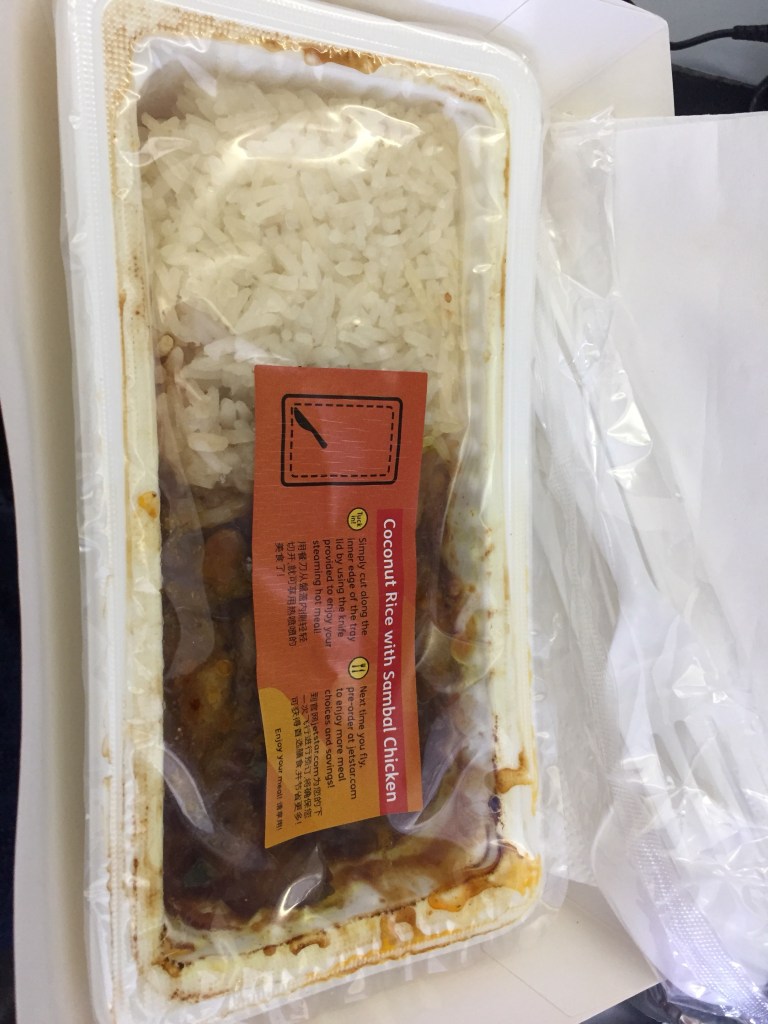 I am on a ‘Plus’ fare which includes baggage, a meal, and QFF points and status credits. I have pre-ordered a meal – Chicken Rice, but am told that it wasn’t brought onto the plane by the catering department, and now have to order something else from the menu. So I choose coconut rice with Sambal chicken instead. There is a stark contrast to what I receive versus what is advertised….