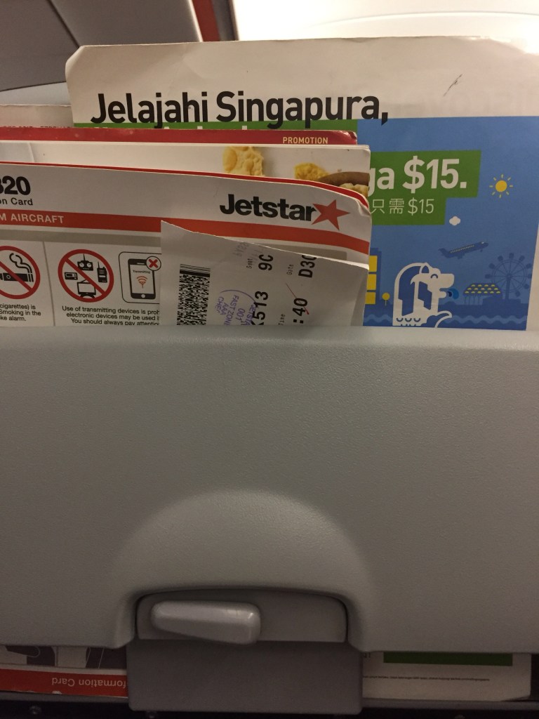 I am sitting in seat 9C, an aisle seat, on this Jetstar Asia Airbus A320 aircraft back to Bangkok. Although not overly comfortable, it is a short flight so bearable. The plane is at full occupancy, yet the efficient flight attendants seamlessly carry out their inflight duties effortlessly and with a warm attitude.