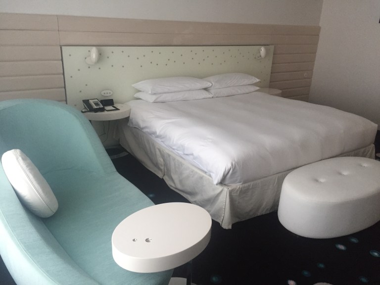 As I enter my room I note the large open space with separate living room and bedroom with bright light tones throughout. There is an espresso machine and a welcome gift from the general manager.
