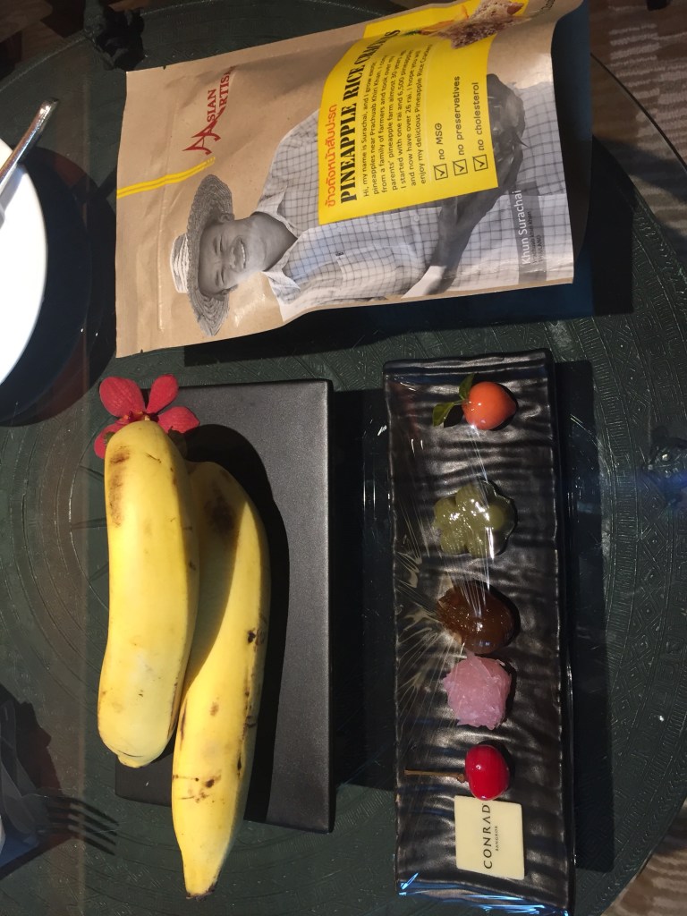 A welcome card from the GM and Thai sweets and fruit greets me in the living room, which has an Nespresso machine, filtered coffee, PlayStation, large flat-screen TV, and numerous other essentials.