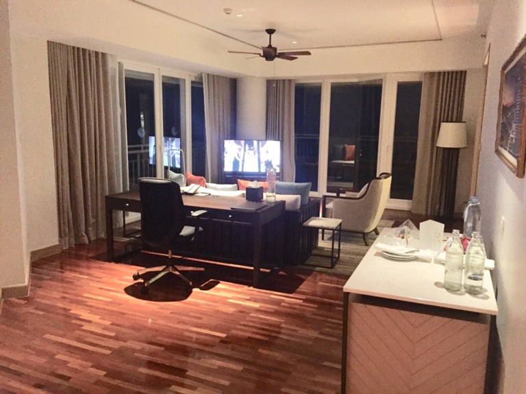 The suite is around 80sqm and is on a renovated floor (the hotel is in need of some TLC) and has a panorama view of the city and ocean.