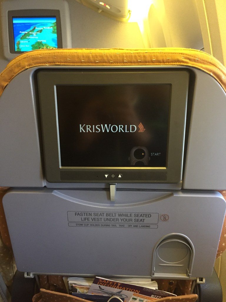 I am sitting in a window seat, a row behind the first row of Economy, on this Singapore Airlines B777-200 airplane bound for Bangkok.