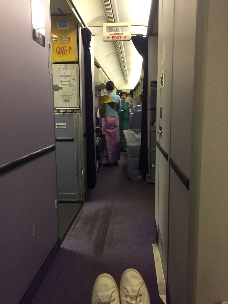 On this final leg of my trip from HKG this afternoon, I am sitting in almost a mirror seat to the one I arrived on on CX – the first row of Economy again with nothing in front of me, in aisle seat 31H, but this time on a Boeing 777-300 Thai Airways aircraft.