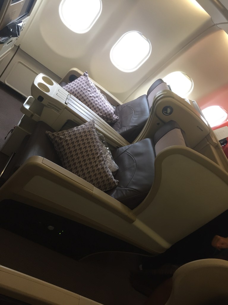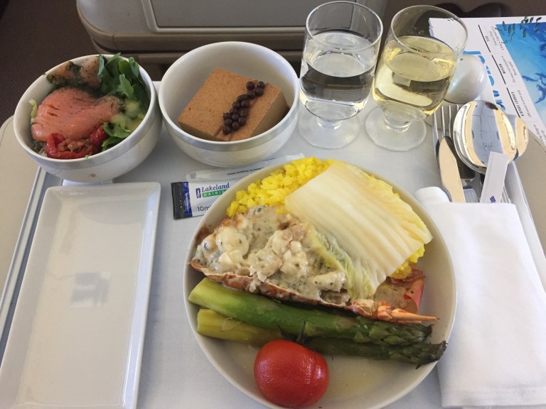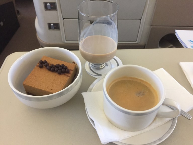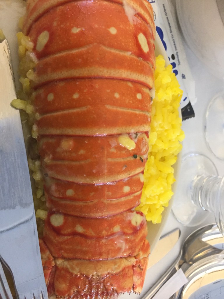 Soon after a very bumpy takeoff the one-tray meal service comes around and I have pre-ordered Lobster Thermidor but it is a little salty. It comes with a Gravadlax and cucumber salad, cappuccino mousse cake (delicious!!) and for me, garlic bread. I have this with 2 small glasses of French white. And…with my dessert I have a double espresso with a shot of steamed milk and a Baileys π€ͺ.