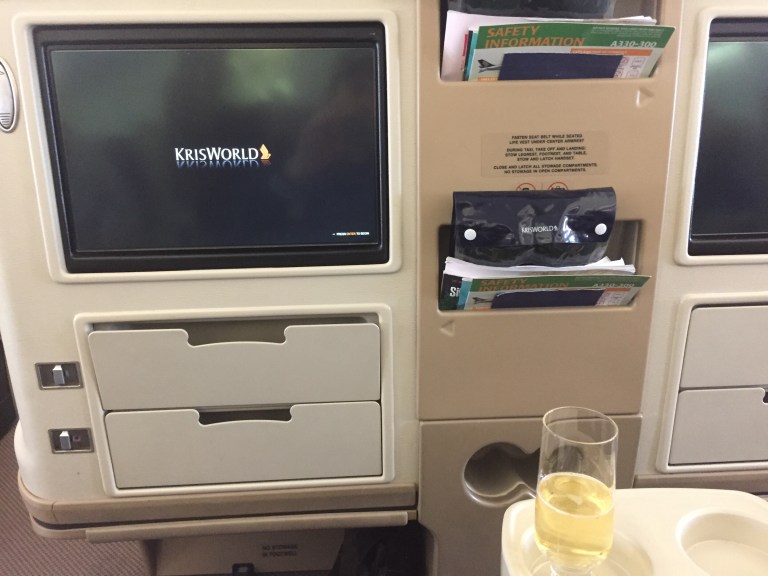 I am sitting in Business Class seat 14D on this Singapore Airlines Airbus A330-300 bound for Denpasar, Bali. Prior to takeoff a hot wet towel comes around and from a drinks tray I choose a glass of champagne.