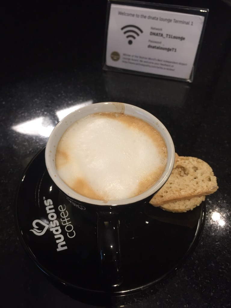 I don’t eat anything although there is a tempting array of delicious food available. And drinks. But I decide not to knowing I will soon be enjoying Lobster Thermidor on my flight to DPS. I just have a Hudson Coffee Barista-made double Macchiato instead.