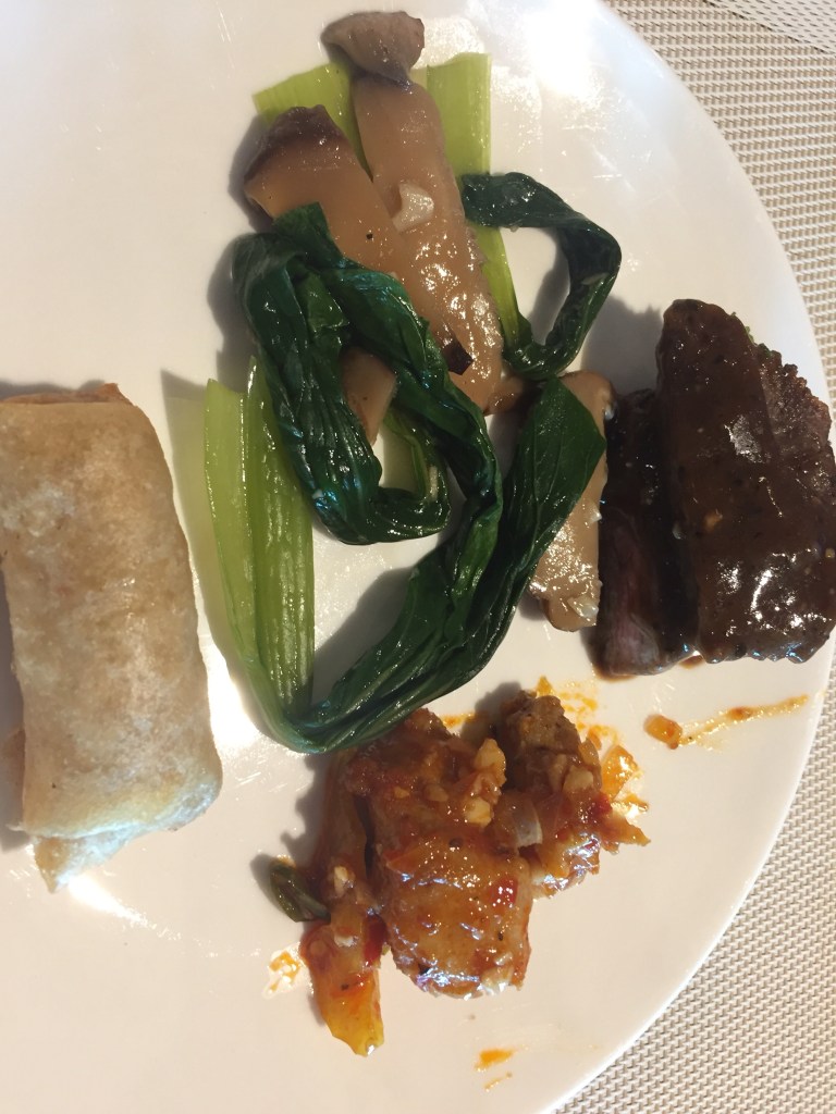 Shortly after I stroll over to the extensive buffet and take a few small bits and pieces – sushi, a samosa, spring roll, grilled beef, bok choy and mushrooms, chilli fish, chicken satay…..ok, maybe quite a bit but one bit of each – as I only had lunch a couple of hours earlier (and I think I have a meal on the plane).