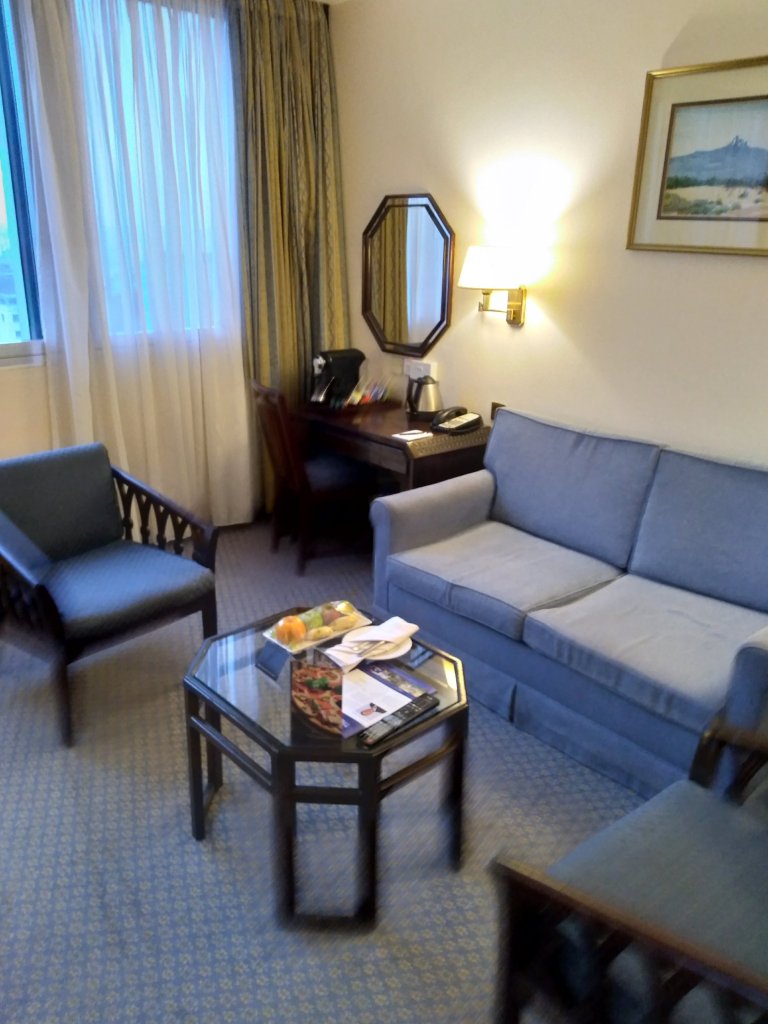 I have arrived at the hotel at six thirty in the morning and my upgraded queen junior suite is ready for me. But before entering the room, I am able to have breakfast in the restaurant adjacent to the lobby. After breakfast I make my way to my room on the 9th floor and immediately noticed a welcome gift from the hotel. The room is essentially 2 rooms combined into one large room, with a separate sitting area, 2 bathrooms and a queen sized bed.