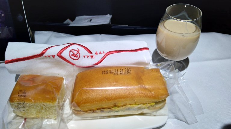 Shortly after take-off the meal service comes around and it is most unusual – a chicken roll (dry), piece of cake (soft), and a drink of choice (Bailey’s for me).