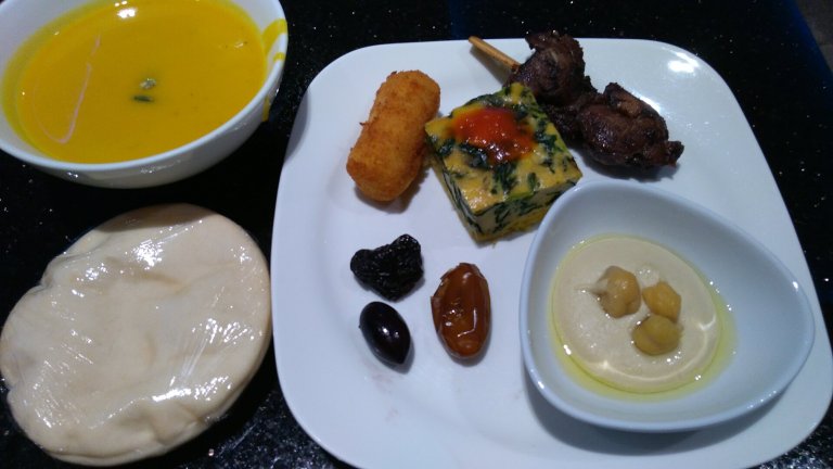 After I find a space to sit, I make my way to the buffet and am so happy to see my favourite Hummus and pita bread which I enjoy with dates and prunes, lemongrass and pumpkin soup, lamb kebab, vegetable croquette, and other delicacies.