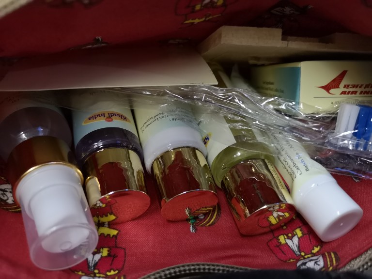 Upon sitting in my seat I am offered a glass of juice which I decline, I stead requesting a bottle of water. Shortly after the ame it kit comes and it is one of the best I have seen and even includes a bar of Sandlewood soap!