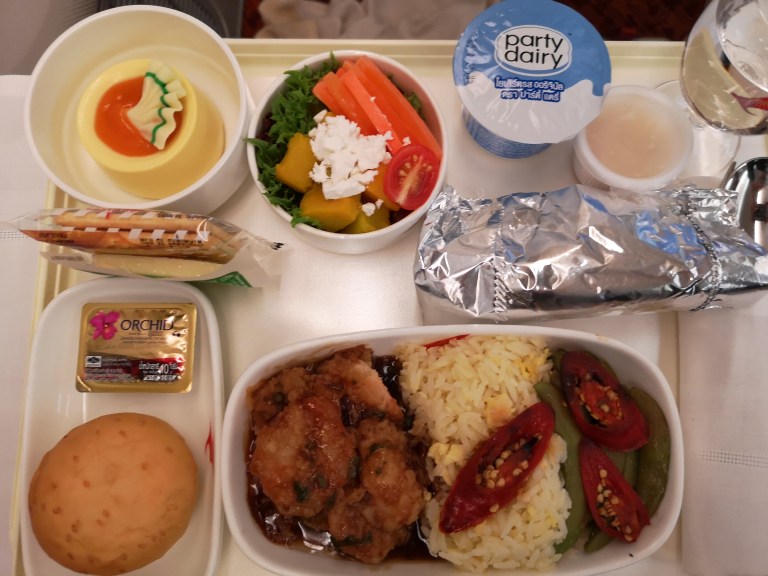 The meal service consists of a choice of vegetarian curry, chicken curry, or prawns, and I choose the latter. It comes with a variety of tantalising bits and pieces and it actually very good. The champagne (not sure what brand it is) is equally as good.