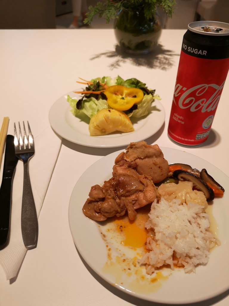I rarely enter this lounge, preferring the First class lounge next door but felt like a change. Massaman chicken and salad is on my list and decide it is a good choice. After about an hour of emails, I decide to leave and walk over to the Oman Lounge.