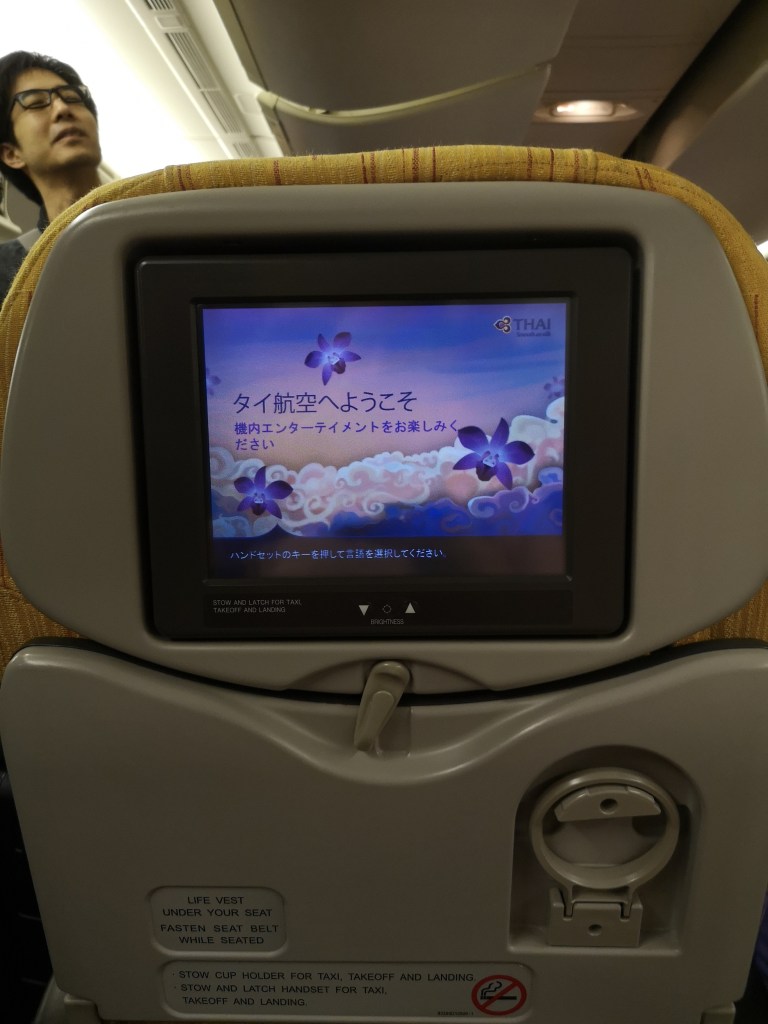 I am sitting in middle aisle seat 36D on this Thai Airways Boeing 777-300 flight bound for Singapore. Its a tad bit old, and the legroom somewhat squashy, but not uncomfortable, thanks to the empty seat next to me.