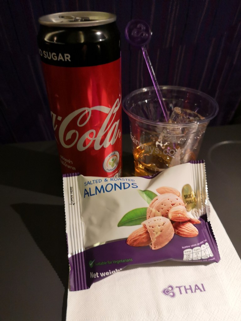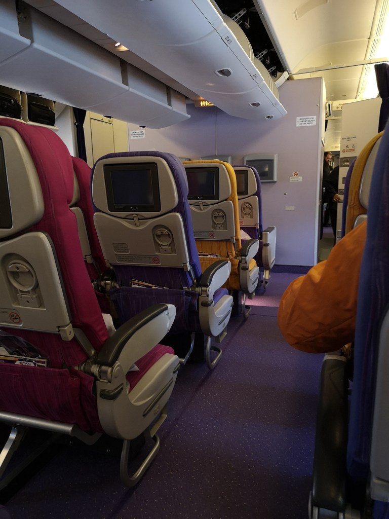 I am sitting in seats 35 H, I, and J (3 seats to myself) on this Thai Airways Boeing 777-200ER flight bound for Taipei. I’m quite lucky as the plane is relatively full (in Economy anyway). The I terior could do with a bit of a refurbishment – this model has the old style square AV screens and minimal recline.