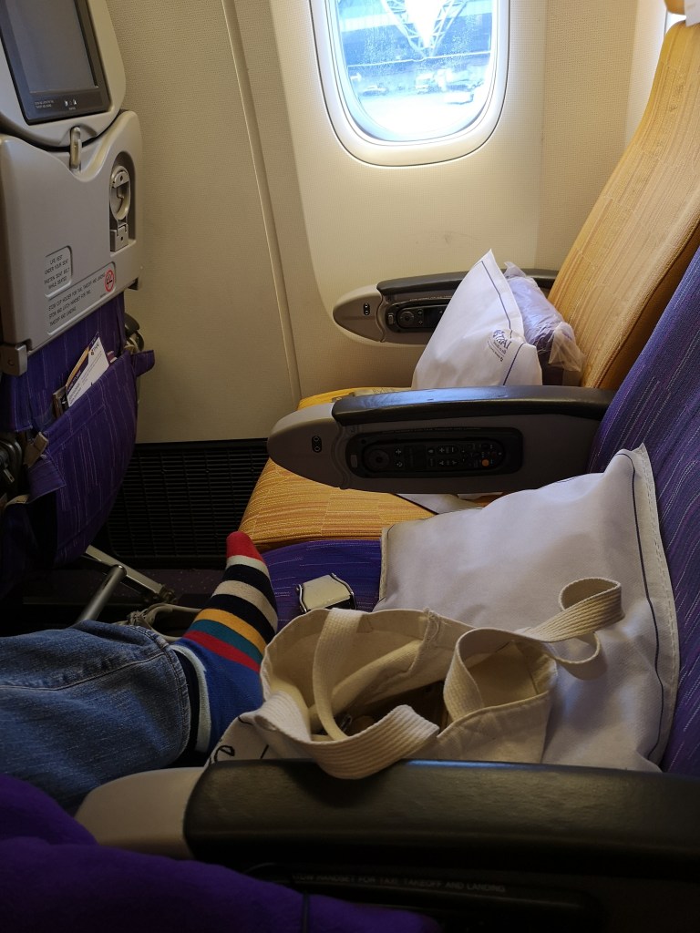 Having the 3 seats to myself allows me to stretch my legs whilst watching a movie, but I am so tired I fall asleep half way through.