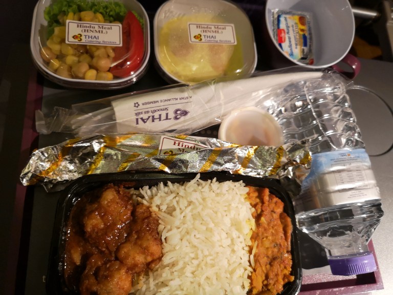 As soon as I sit down (I am the first on the plane), my Hindu Meal is confirmed and shortly after take-off pre-dinner drinks and nuts are served. This is followed by my meal, consisting of rice with fried fish and Dahl curry, and a creamy rice-type dessert.