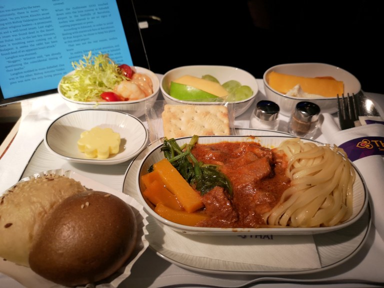 I am sitting in seat 14B, a window seat on this Thai Airways Boeing 777-300ER flight bound for Bangkok. The configuration of the cabin is 1-2-1 and each seat has direct aisle access. There are mixed reviews on this suite, ranging from an amazing product to the fully-flat bed position being too narrow. As for me, I think it’s one of the best cabins I’ve flown in.