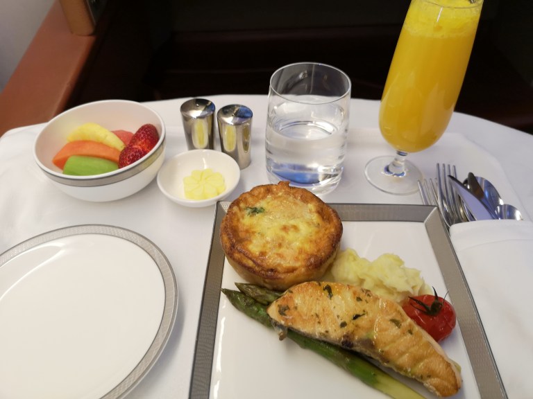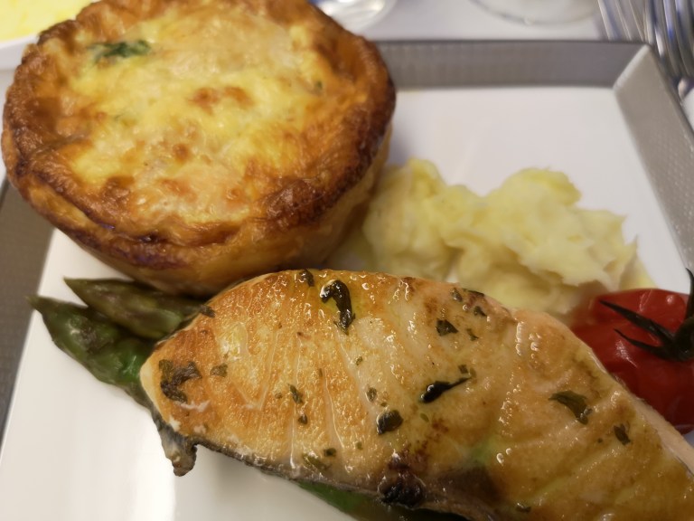 For my breakfast I have chosen the Baked Smoked Salmon Quiche with Seared Salmon Fillet served with parsnip puree, asparagus, mesclun and basil oil. Another glass of Champagne (but this time with orange juice – heresy and a double espresso with steamed milk tops it off.