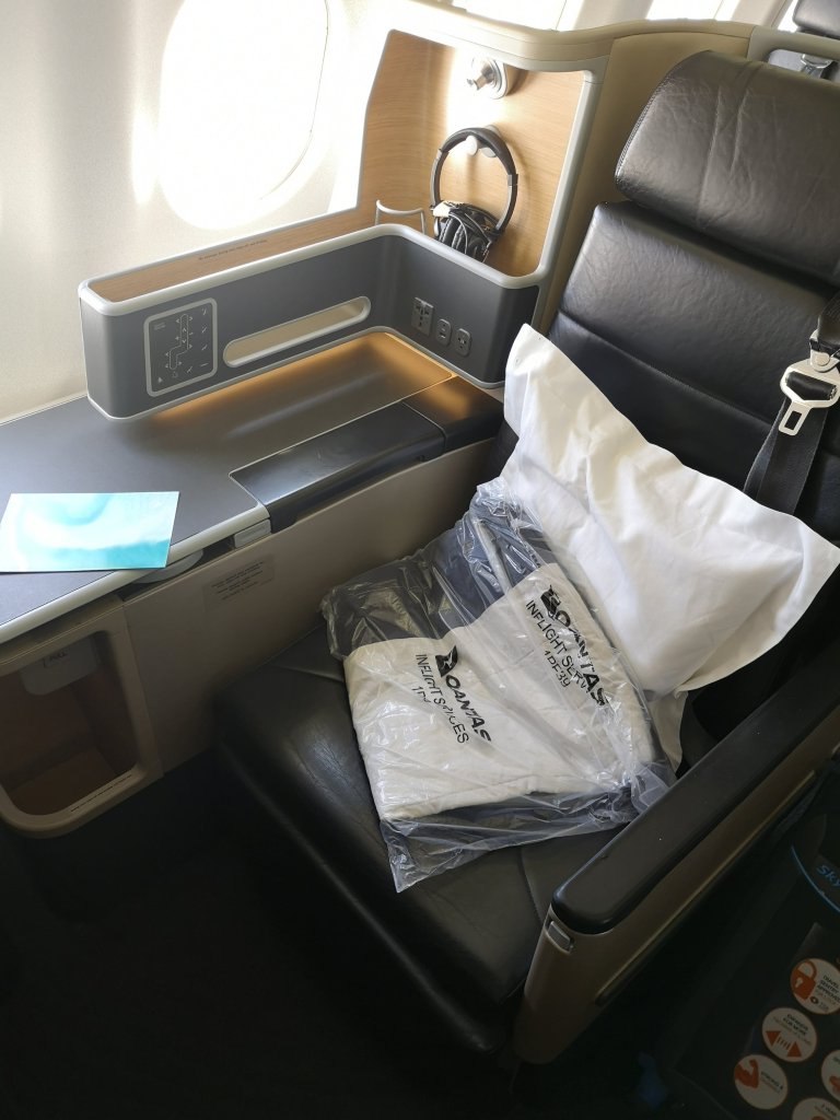 I am sitting in seat 3H in the middle of the Business Class cabin on this Airbus A330-300 Qantas flight bound for Sydney. I have used 25,000 miles to upgrade my ex-work paid ticket. Pretty good use of miles considering Business Class on this route is extremely expensive.