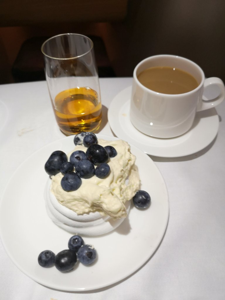 I choose the Seared Ocean Trout entree, followed by the Red Braised Chicken. This is finished with Baked Meringue with Passionfruit cream and strawberries (but comes with Blueberries :)) AND the Maggie Beer burnt fig ice-cream. Yum. The dessert goes well with a glass of dessert wine.
