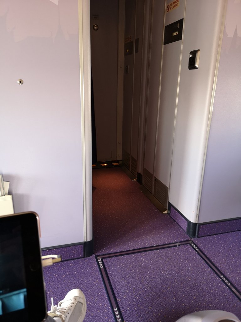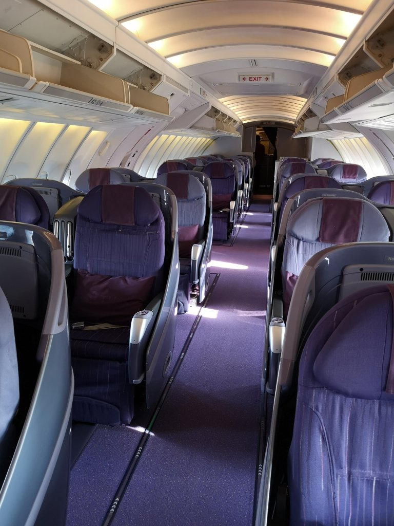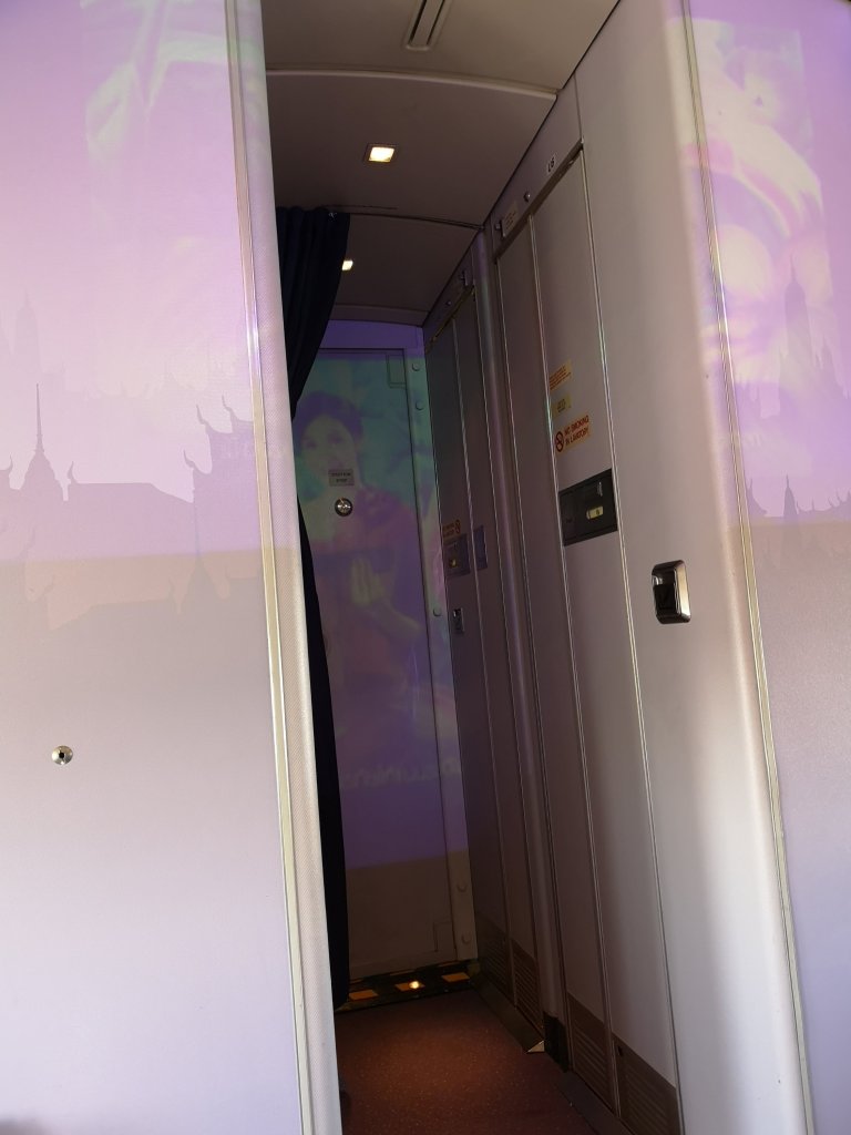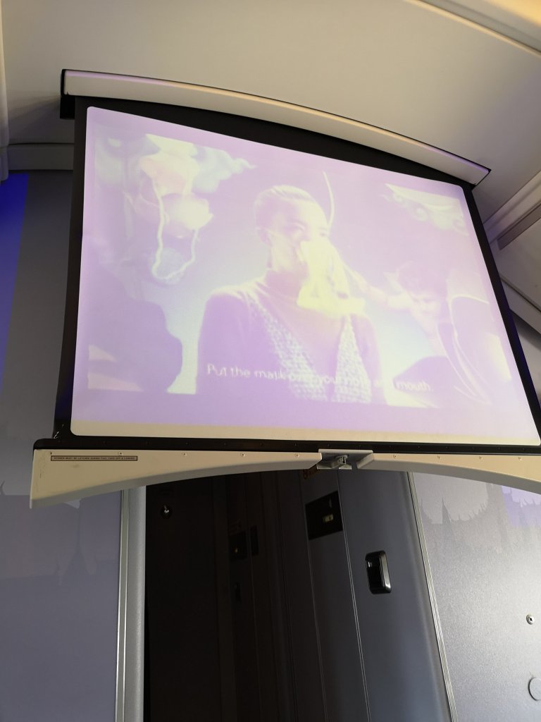 These 747s still used by Thai are so old, there are almost too funny. When the emergency video is put on, the flight attendant forgets to pull down the projector screen so the video is projected on the toilets and cockpit door….halfway through she realises and rushes over to rectify the oversight.
