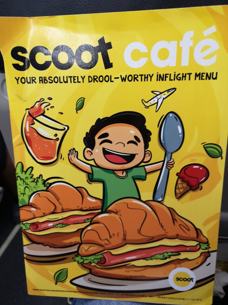 So what to do on this 4 hour 20 min flight? For a start my iPad comes in handy, preloaded with entertainment. There are also 3 inflight reading materials – the Scoot magazine, a duty free catalogue, and the equally as thick Scoot Cafe menu book, all at heavily inflated prices (think USD 4 for a can of Diet Coke or packet coffee).