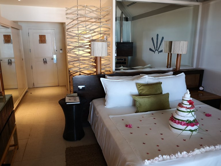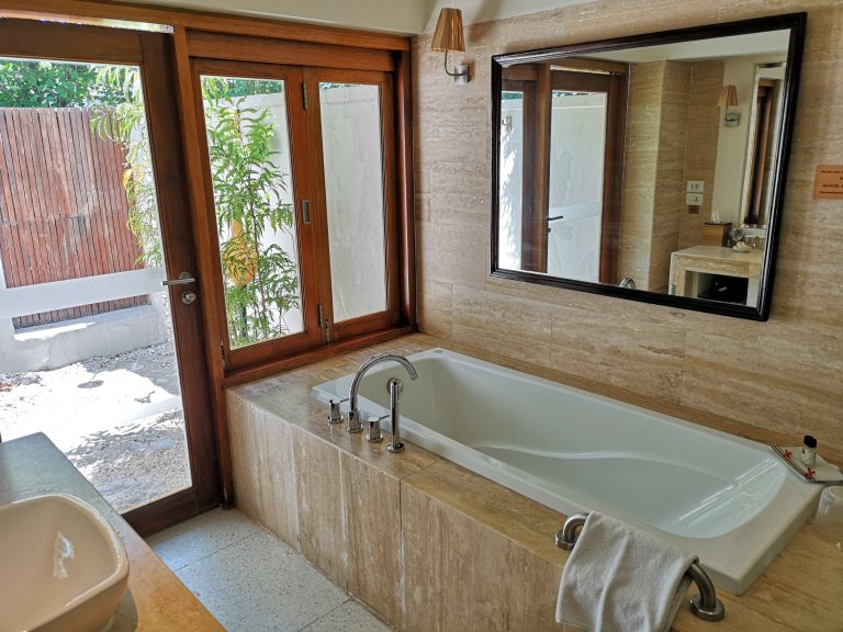 Our Beach villa is #227 – probably one of the best as it leads out to a sandy stretch of beach, unlike the others that are rocky with coral and shells. A hammock and sun-deck chairs are available for use. Inside the room is a double-bed, good sized bathroom with separate bath and shower, and an outdoor shower area as well. In all honesty it could do with a renovation. The same goes for our slightly larger overwater villa #132 on our third night. Basically the same as the beach villa internally, but overwater.