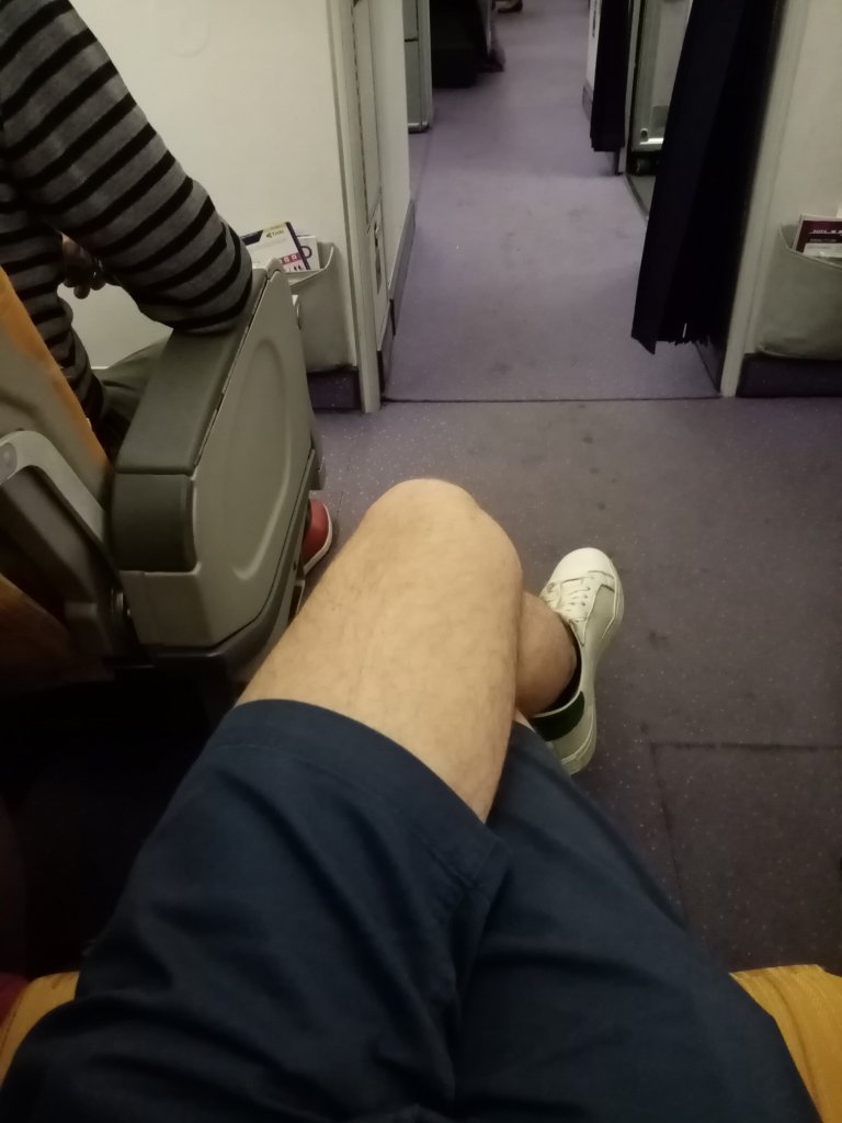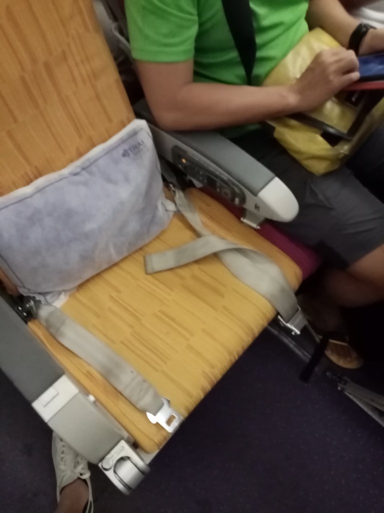 I am the last to board on this Thai Airways Boeing 777-200 aircraft bound for Singapore. I have been allocated seat 32C, with no seat in front of me, giving me ample leg room. Didn’t notice this on seat guru.com.