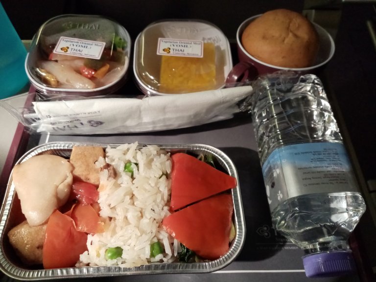 It’s a short flight, and as soon as the seat belt lights are extinguished, my pre-ordered Oriental Vegetarian meal is brought to me. I thought I’d give it a try but I don’t really like it so won’t be ordering it again. Typically the standard meal looks much better.