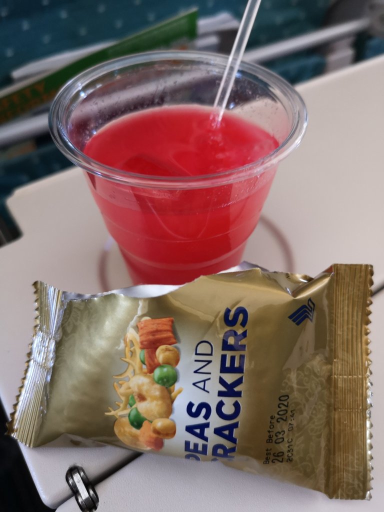 Shortly after take-off, the onboard service begins, starting with a hot wet towel, handing out of menus, and aperitifs. I choose a signature Singapore Sling which is served with a packet of peas and crackers.